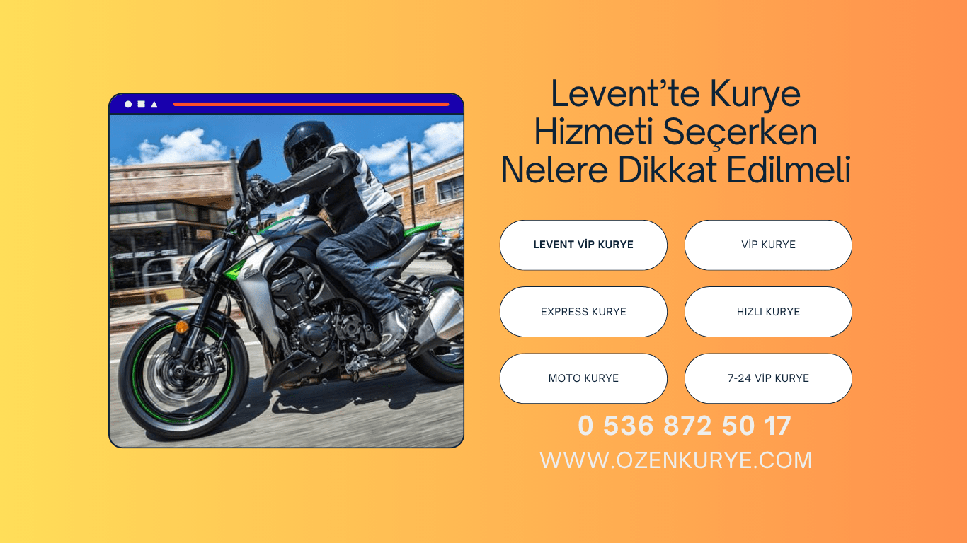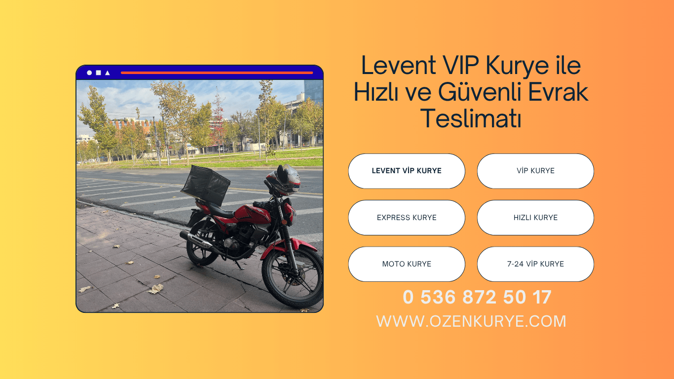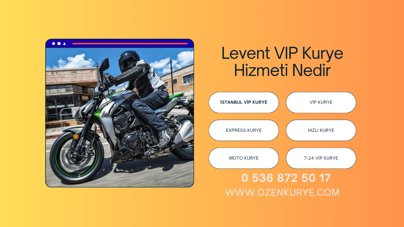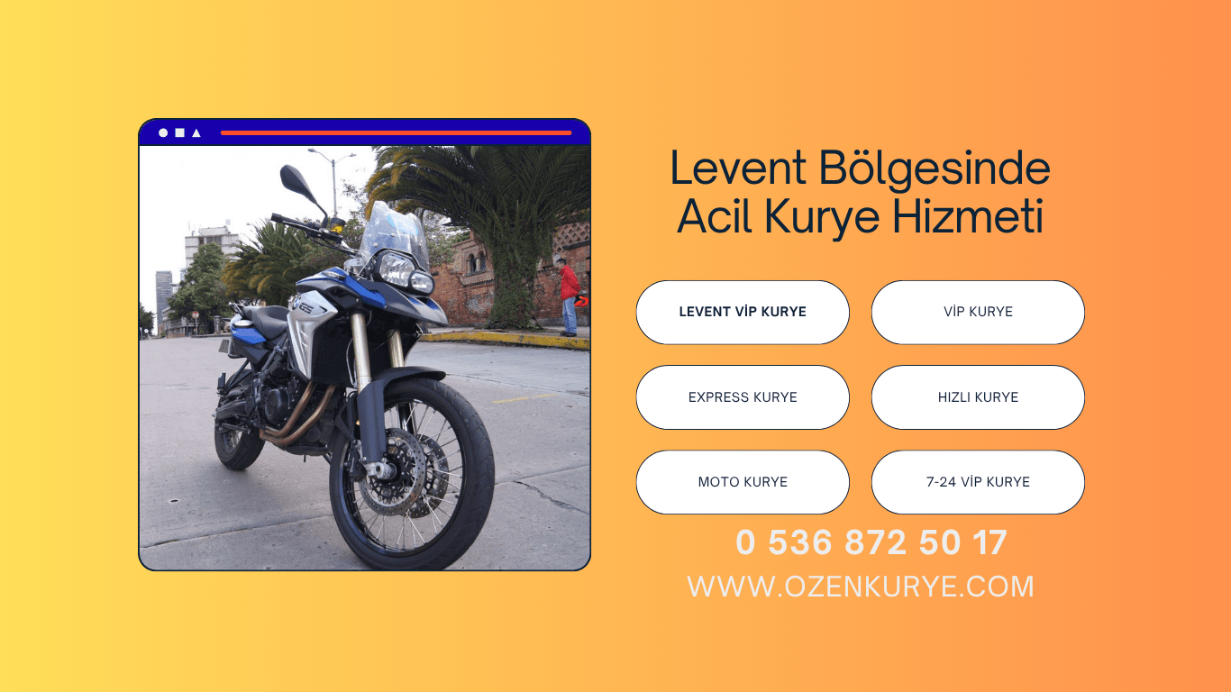 Levent bölgesinde VIP kurye ihtiyaçlarınız için Özen Kurye'yi tercih ederek gönderilerinizi hızlı, güvenli ve gizlilik içinde ulaştırabilirsiniz. Zamanınız değerliyse hemen bizimle iletişime geçin — adresinize özel kurye gönderelim.